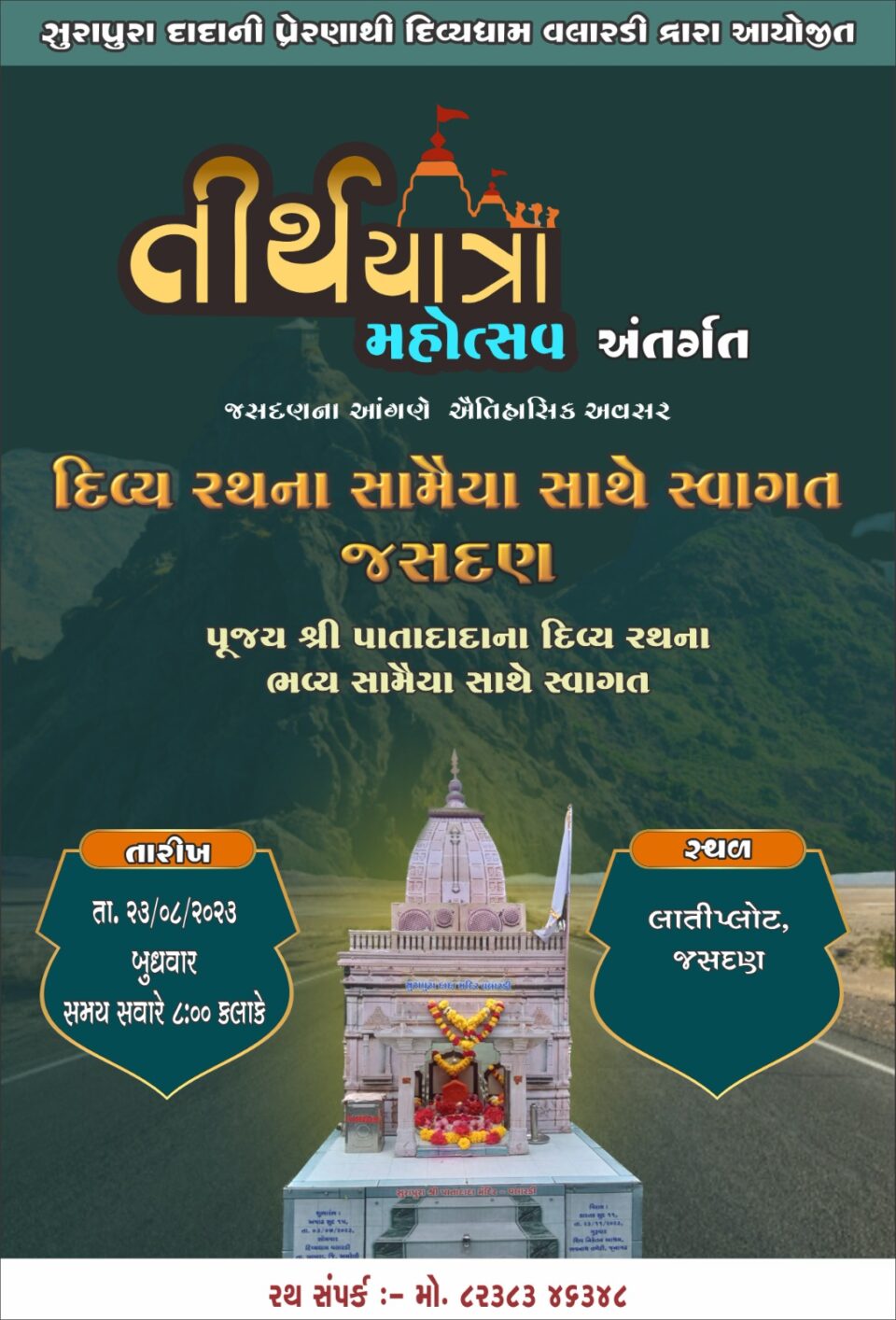 દિવ્યધામ વલારડી દ્વારા આયોજિત તીર્થયાત્રા મહોત્સવ જુનાગઢ અંતર્ગત પરમ પૂજ્ય સુરાપુરા શ્રી પાતા દાદા નો દિવ્ય રથ જસદણના આંગણે તારીખ 23/ 8/2023 ને બુધવાર સવારે 8:30 કલાકે દાદાના દિવ્ય રથના સ્વાગત સાથે સામૈયા અને સાથે મહા આરતીનું આયોજન છે આ આયોજનમાં આપ સૌ ભક્તજનોને ભાવભર્યુ આમંત્રણ છે
