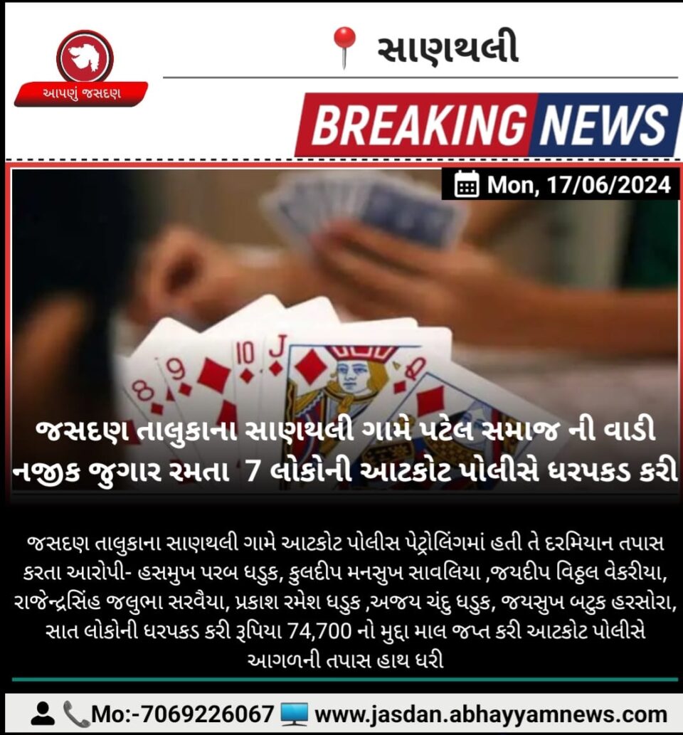 જસદણ તાલુકાના સાણથલી ગામે આટકોટ પોલીસ પેટ્રોલિંગમાં હતી તે દરમિયાન તપાસ કરતા આરોપી- હસમુખ પરબ ધડુક, કુલદીપ મનસુખ સાવલિયા ,જયદીપ વિઠ્ઠલ વેકરીયા, રાજેન્દ્રસિંહ જલુભા સરવૈયા, પ્રકાશ રમેશ ધડુક ,અજય ચંદુ ધડુક, જયસુખ બટુક હરસોરા, સાત લોકોની ધરપકડ કરી રૂપિયા 74,700 નો મુદ્દા માલ જપ્ત કરી આટકોટ પોલીસે આગળની તપાસ હાથ ધરી