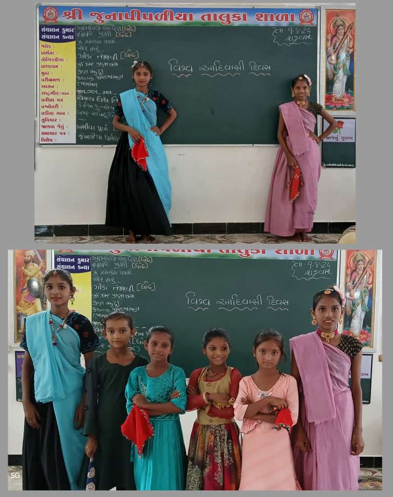 જસદણ તાલુકાની શ્રી જુનાપીપળીયા તા.શાળામાં વિશ્વ આદિવાસી દિવસની ઉજવણી કરવામાં આવી.જેમાં શાળામાં અભ્યાસ કરતાં આદિવાસી બાળકો દ્વારા તેમના પારંપરિક પોષાક સાથે આદિવાસી ગીતો પર ડાન્સ રજુ કરી તેના સાંસ્કૃતિક જીવનની ઝાંખી કરાવી હતી.તેમજ બાળકોએ ઉત્સાહભેર આદિવાસીગીતોના તાલે જૂમ્યાં હતાં.