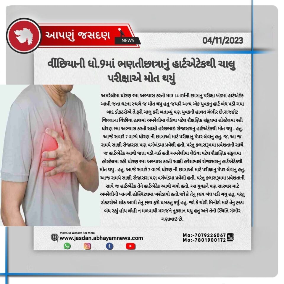 અમરેલીમા ધોરણ મા અભ્યાસ કરતી માત્ર 14 વર્ષની છાત્રાનુ પરીક્ષા ખંડમા હાર્ટએટેક આવી જતા ઘટના સ્થળે જ મોત થયુ હતુ જયારે અન્ય એક યુવકનુ હાર્ટ બંધ પડી ગયા બાદ ડોકટરોએ તે ફરી ચાલુ કરી બતાવ્યું પણ યુવકની હાલત ગંભીર છે.રાજકોટ જિલ્લાના વિછીયા હાલમાં અમરેલીમા લેઉવા પટેલ શૈક્ષણિક સંકુલમા હોસ્ટેલમા રહી ધોરણ માા અભ્યાસ કરતી સાક્ષી હરેશભાઇ રોજાસરાનુ હાર્ટએટેકથી મોત થયુ હતુ. આજે સવારે 7 વાગ્યે ધોરણ ની છાત્રાઓ માટે પરીક્ષાનુ પેપર લેવાનુ હતુ. જ. આ જ સમયે સાક્ષી રોજાસરા પણ વર્ગખંડમા પ્રવેશી હતી, પરંતુ કલાસરૂમમા પ્રવેશતાની સાથે જ હાર્ટએટેક આવી જતા પડી ગઈ હતી અમરેલીમા લેઉવા પટેલ શૈક્ષણિક સંકુલમા હોસ્ટેલમા રહી ધોરણ મા અભ્યાસ કરતી સાક્ષી હરેરાભાઇ રોજાસરાનુ હાર્ટએટેકથી મોત થયુ . હતું. આજે સવારે 7 વાગ્યે ધોરણ ની છાત્રાઓ માટે પરીક્ષાનુ પેપર લેવાનુ હતુ. આજ સમયે સાક્ષી રોજાસરા પણ વર્ગખંડમા પ્રવેશી હતી, પરંતુ ક્લાસરૂમમાં પ્રવેશતાની સાથે જ હાર્ટએટેક તેને હાર્ટએટેક આવી ગયો હતો. આ યુવકને પણ સારવાર માટે અમરેલીની ખાનગી હોસ્પિટલમા ખસેડાયો હતો.જો કે તેનુ હ્દય બંધ પડી ગયુ હતુ. પરંતુ ડોકટરોએ શોક આપી તેનુ હ્દય ફરી ધબકતુ કર્યુ હતુ. જો કે થોડી મિનીટો માટે તેનુ હ્દય બંધ રહ્યું હોય લોહી ન મળવાથી મગજને નુકશાન થયુ હતુ અને તેની સ્થિતિ ગંભીર ગણાવાઇ છે.