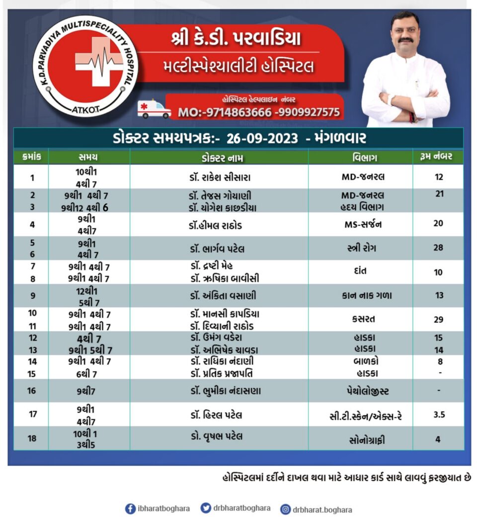 શ્રી કે.ડી.પરવાડિયા મલ્ટીસ્પેશ્યાલીટી હોસ્પિટલ આટકોટ, તારીખ-26/09/2023 ડોક્ટર સમયપત્રક