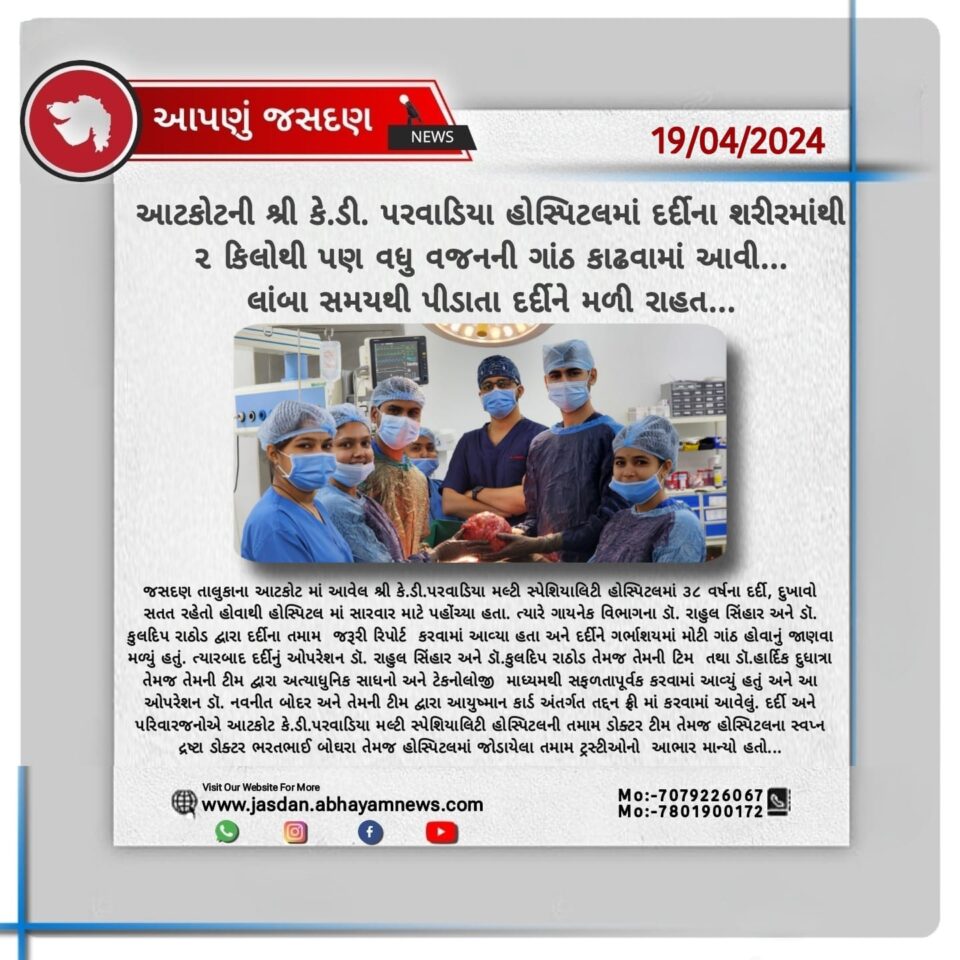 જસદણ તાલુકાના આટકોટ માં આવેલ શ્રી કે.ડી.પરવાડિયા મલ્ટી સ્પેશિયાલિટી હોસ્પિટલમાં ૩૮ વર્ષના દર્દી, દુખાવો સતત રહેતો હોવાથી હોસ્પિટલ માં સારવાર માટે પહોંચ્યા હતા. ત્યારે ગાયનેક વિભાગના ડૉ. રાહુલ સિંહાર અને ડૉ. કુલદિપ રાઠોડ દ્વારા દર્દીના તમામ જરૂરી રિપોર્ટ કરવામાં આવ્યા હતા અને દર્દીને ગર્ભાશયમાં મોટી ગાંઠ હોવાનું જાણવા મળ્યું હતું. ત્યારબાદ દર્દીનું ઓપરેશન ડૉ. રાહુલ સિંહાર અને ડૉ.કુલદિપ રાઠોડ તેમજ તેમની ટિમ તથા ડૉ.હાર્દિક દુધાત્રા તેમજ તેમની ટીમ દ્વારા અત્યાધુનિક સાધનો અને ટેકનોલોજી માધ્યમથી સફળતાપૂર્વક કરવામાં આવ્યું હતું અને આ ઓપરેશન ડૉ. નવનીત બોદર અને તેમની ટીમ દ્વારા આયુષ્માન કાર્ડ અંતર્ગત તદ્દન ફ્રી માં કરવામાં આવેલું. દર્દી અને પરિવારજનોએ આટકોટ કે.ડી.પરવાડિયા મલ્ટી સ્પેશિયાલિટી હોસ્પિટલની તમામ ડોક્ટર ટીમ તેમજ હોસ્પિટલના સ્વપ્ન દ્રષ્ટા ડોક્ટર ભરતભાઈ બોઘરા તેમજ હોસ્પિટલમાં જોડાયેલા તમામ ટ્રસ્ટીઓનો આભાર માન્યો હતો…